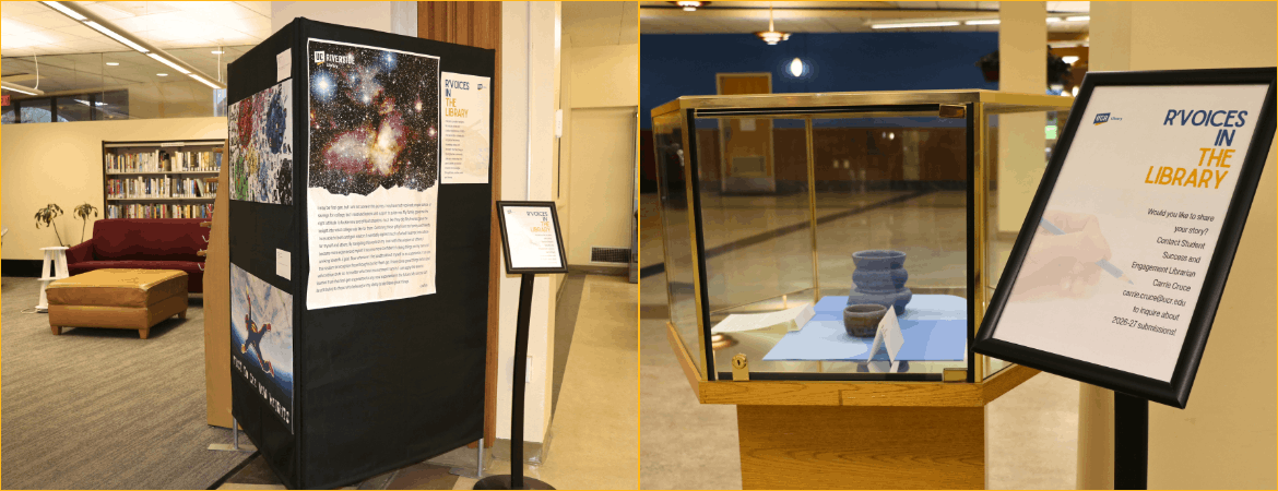 The UCR Library is proud to present R’Voices in the Library, a rotating exhibition dedicated to celebrating the unique experiences and creative talents of our first-generation college students.