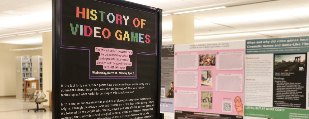 This poster exhibition is the result of an ongoing partnership between the UCR Department of History and the Library’s Teaching and Learning Department. The posters on display showcase not only students' ability to find and critically engage with primary documents, but their capacity to tell new stories — about video games, through video games, and with video games.