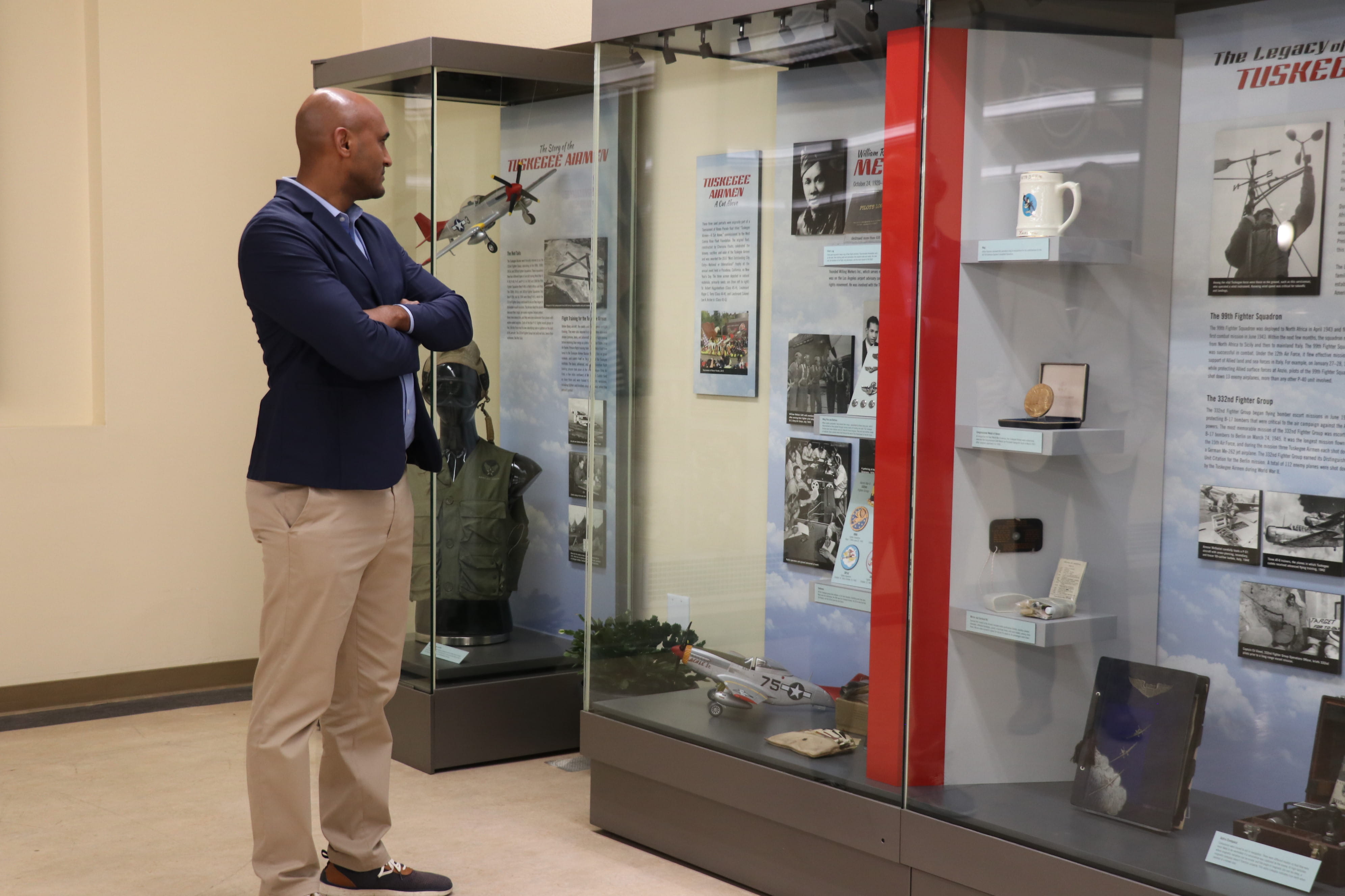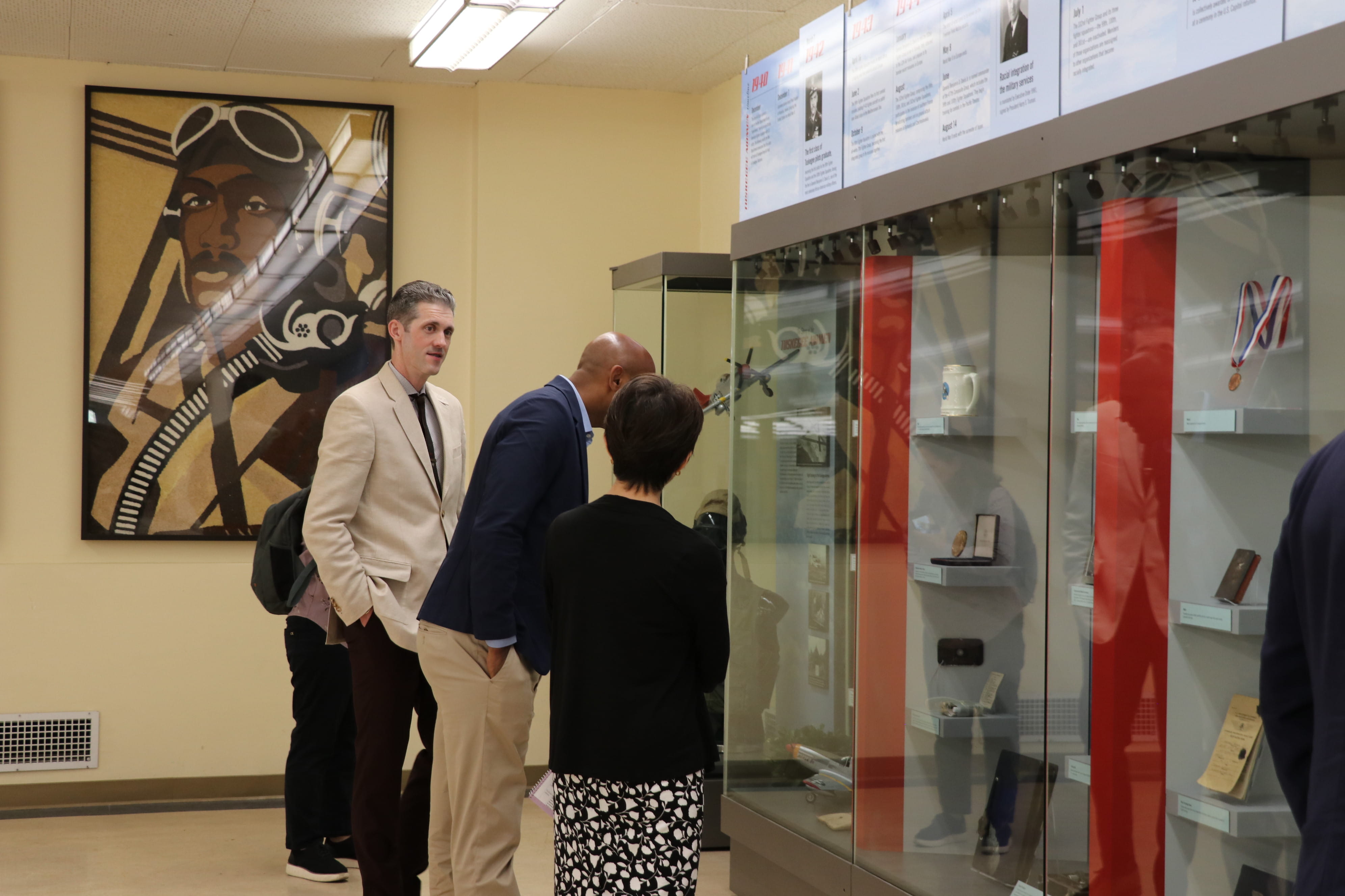 The visit began on the first floor, where the Congressman viewed our long-standing exhibit dedicated to Tuskegee Airmen history. As the representative for Alabama's 2nd Congressional District, which includes Tuskegee, the exhibit held particular personal significance. Alongside the exhibit, he viewed paintings of Tuskegee Airmen displayed to the left, which were originally featured on a 2010 Rose Parade float honoring the Airmen’s legacy.